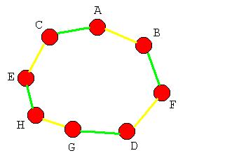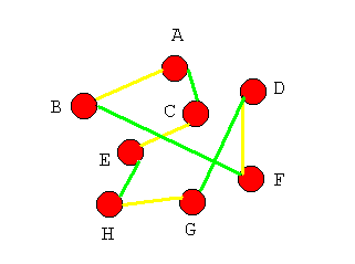 Figure 1: an example of a graph with vertices A, B, C, D, E, F, G and H and two types of edges connecting them: yellow and green. |