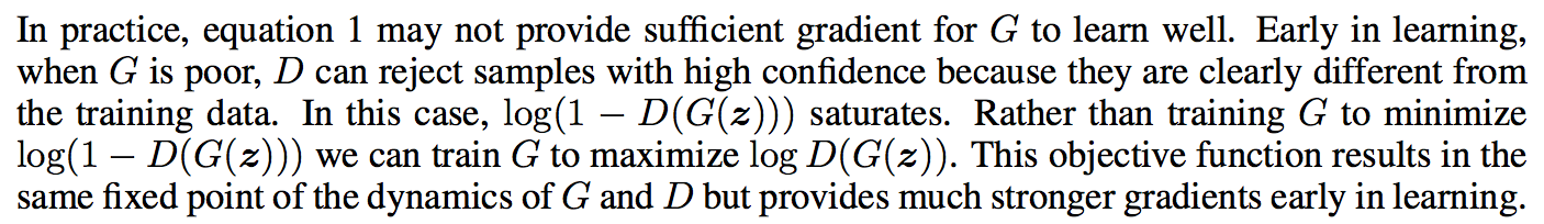 In essence, we replaced by . These two functions are monotonically related, but have high gradients for different values of . This nonlinear transformation allows the GAN algorithm to coneverge faster. (Well, sort of. When it does converge. It's still pretty unstable in my experience.)