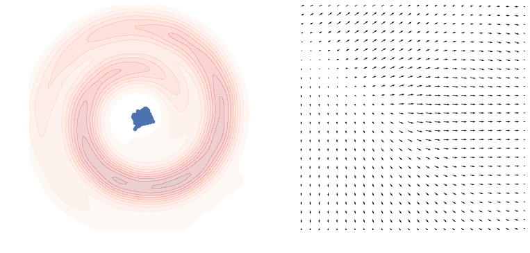 This is basically it, the image below shows what this variant of the algorithm does in practice on the Swiss roll toy example. It doesn't converge all the way in this animation, and possibly hyperparameters could be improved. The red contours show the real data distribution that we would like to model. The green dots show samples from the generative model, as training progresses. (each frame shows a subsequent but with the hidden variable fixed throughout). The right-hand image shows the gradients of the objective function and how they change over time: