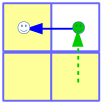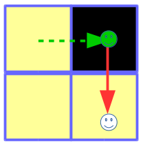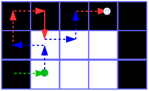 GREEN arrow indicates the bug's current spot and directionsRED arrow indicates RIGHT turnBLUE arrow indicates LEFT turn(startRow,startCol) will be non-BLACK.