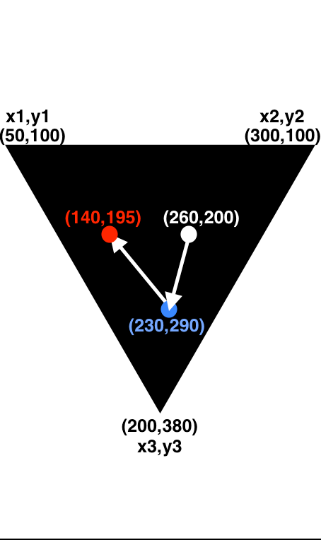Here is an example of a possible execution when the game is run for only 2 moves in the triangle (50, 100), (300, 100), (200, 380) and the player touched point (260,200):