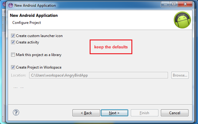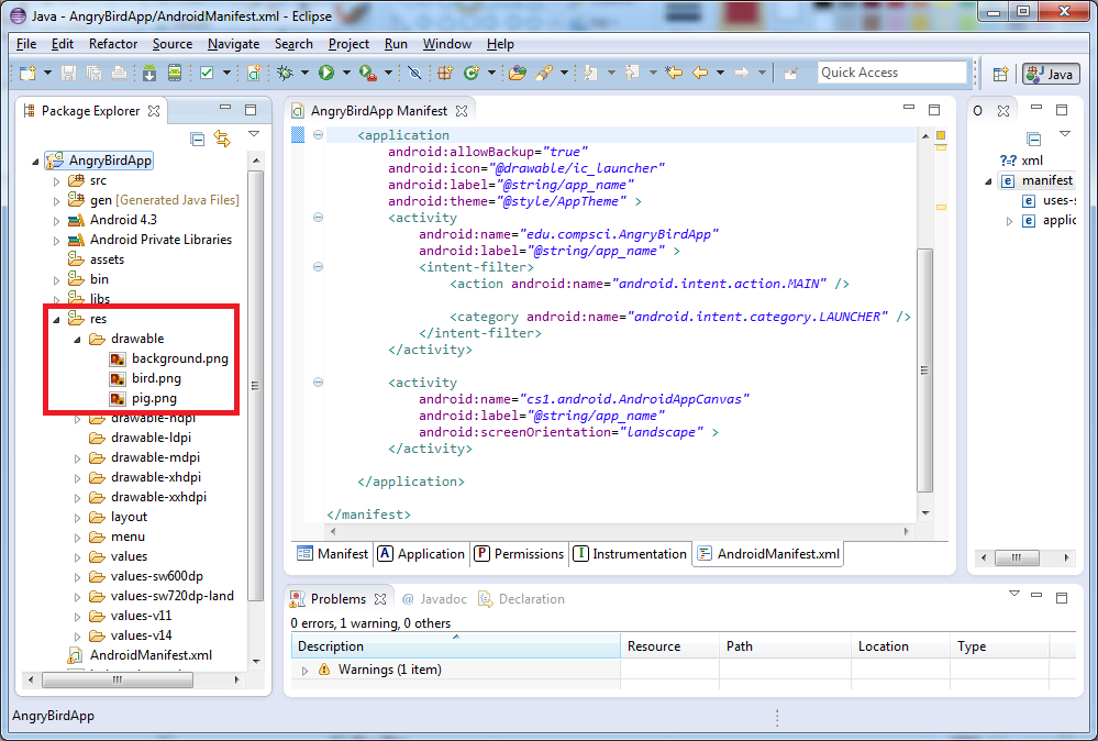 For the AngryBirdApp example, outside Eclipse use your system's file browser to copy the drawable folder provided here to the res/ folder of the project created by Eclipse.