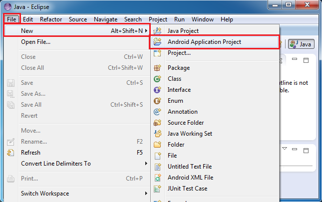| File->New->Android | Project Name | Project Config | Icon Config | Blank Activity | Activity Name |