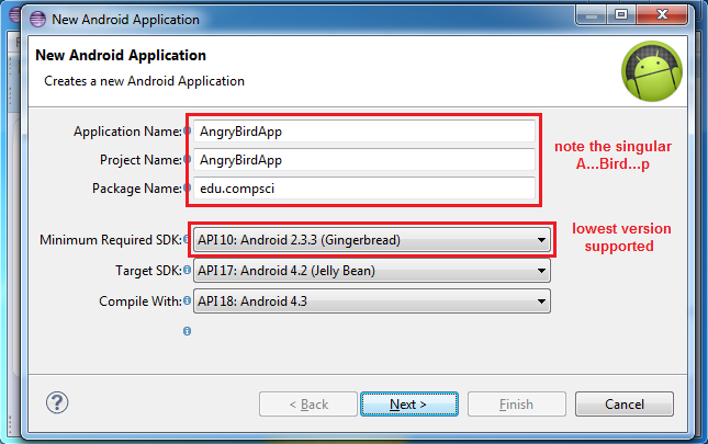Click each of the images to see what information needs to be filled in. In this example the project name is AngryBirdApp (note the singular ...Bird...):
